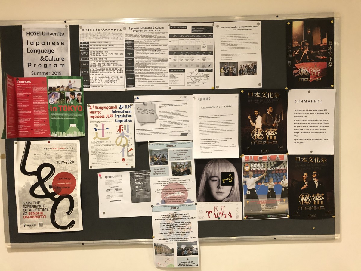 △掲示板には日本関連の案内もたくさん!さて、いよいよ、教室の並ぶ廊下を進んだ先、