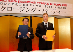 午後5時30分から、クロージングパーティーが東京オペラシティ2Fホワイエで開かれ、ロシア側を代表してミハイル・シュビトコイ・ロシア連邦大統領文化特別代理が挨拶、「感動的な三つのアヴェ・マリア、豊かなハーモニーのサンクト・ペテルブルグの音楽家の皆さんに心から感謝します。3・11東日本大震災のあと寄せられた日本組織委員会の必ずフェスティバルを実現し成功させたいという決意の手紙をいま忘れることはできません。われわれは本当に出来るのか、開催することが適切なのかということに迷っていましたが、実施する決意をし、派遣する芸術家にも協力をいただき、被災者を公演に招待し、募金を行い、本日に至るように大きく成功することができたことを皆さんと喜びあいたいと思います。来年は大阪で6月に公式オープニングセレモニーをおこないます。」とのべました。